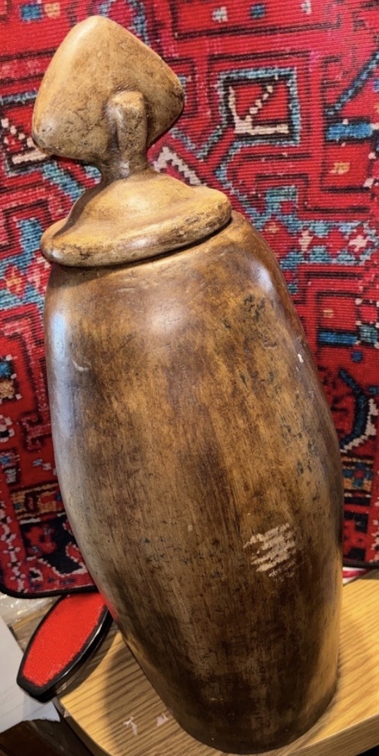 This is a hand-carved lidded wooden vessel, likely of mid-20th-century ethnographic or artisan origin. It features a tall, slender ovoid or 'cigar-shaped' body that tapers toward a flat, stabilized base. The construction is solid wood, exhibiting a rich, multi-toned brown finish with a visible vertical grain pattern. The lid is a significant design element, featuring a stepped circular flange and a distinctive, large abstract geometric finial shaped like a rounded spade or arrowhead. The finial is connected via a short, structural neck, suggesting a focus on both form and utility. The surface indicates a hand-turned or hand-sculpted process rather than mass industrial production, evidenced by subtle irregularities in the curvature. In terms of condition, the piece shows significant evidence of age and use; there are prominent horizontal scuff marks and loss of finish near the lower third of the body, revealing a lighter wood tone beneath. The finish is characterized by a deep, varied patina with darker staining in the recesses. Small chips are visible on the edges of the finial and the lid collar. The style is reminiscent of African or South Asian tribal storage containers, though it may also be a piece of mid-century Modernist studio craft. There are no clearly visible maker's marks or stamps in this view. The craftsmanship displays a high level of balance and intentionality in its primitive-modernist aesthetic.
