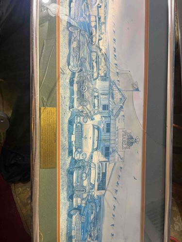 This item is an elongated, panoramas-style framed artwork featuring a nostalgic scene of mid-century vintage automobiles parked in front of a rustic building. The artwork is rendered primarily in denim blue ink on a light cream or off-white paper stock, creating a monochromatic atmospheric effect. The vehicles depicted possess the rounded fenders and chrome grills characteristic of the 1940s and 1950s automotive design. The setting includes a building labeled with signage that appears to read 'Peaslee's' or a similar local establishment, suggesting a regional Americana theme. The piece is professionally matted with multiple layers, including a dark green outer mat and a thin burnt-orange inner accent mat. It is housed in a contemporary chrome or polished metal frame. A notable feature is a gold-toned descriptive plaque or label affixed to the left side of the matting, which may contain provenance or artist information. The glass exhibits a significant structural condition issue: a large, diagonal crack runs from the upper-right corner toward the center, which could potentially scratch the underlying print if not addressed. The print itself appears well-preserved despite the frame damage, showing crisp linework and no obvious water staining or fading to the blue pigment. The style suggests a late 20th-century commemorative or illustrative print designed to evoke mid-century nostalgia.