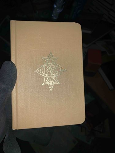 This is a small, pocket-sized hardcover book featuring a tan or light beige cloth binding with a pronounced woven texture. The primary aesthetic feature is a gold-foil gilded monogram or sigil centered on the front cover. The design incorporates a stylized six-pointed star or hexagram intertwined with an 'O' and other calligraphic elements, suggesting an occult or esoteric theme, often associated with publications like 'Thelema' or 'Ordo Templi Orientis' works. The book has rounded corners on the fore-edge, which is a design choice typically seen in liturgical or ritualistic texts to prevent wear during frequent handling. The binding appears to be modern, likely late 20th to early 21st century, utilizing durable synthetic cloth over rigid boards. In terms of condition, the gold gilding remains bright with minimal fading, though there is a small darker spot or stain just above the right side of the emblem. The spine appears straight and the corners are relatively sharp, indicating the book has been well-preserved or is part of a limited specialty printing. The craftsmanship indicates a high-quality private press production rather than a mass-market trade paperback.