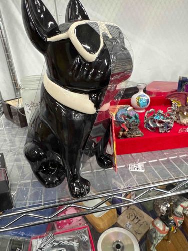 This is a decorative ceramic figurine depicting a stylized French Bulldog, sitting in an upright, attentive posture. Measuring approximately 10 to 12 inches in height, the piece is constructed from molded earthenware or stoneware with a high-gloss glaze finish. The primary color is a deep jet black, contrasted by off-white or cream-colored accents on the oversized sunglasses and wide collar. The figurine features the breed's characteristic 'bat' ears and a shortened muzzle, styled with a modern, slightly whimsical aesthetic. Notable features include the integrated sculpted sunglasses that give the dog a 'cool' or anthropomorphic personality. The craftsmanship shows smooth contours and a uniform application of glaze, suggesting a contemporary retail origin rather than a bespoke artisan piece. The condition appears to be good with a strong surface sheen, though high-gloss black ceramics are prone to showing fine surface scratches and dust. No major chips or cracks are immediately visible in the image. This piece likely dates from the late 20th to early 21st century, fitting into modern 'pop art' or boutique home decor styles. There are no visible maker's marks from this angle, but such items typically bear a brand stamp or 'made in' sticker on the unglazed base.