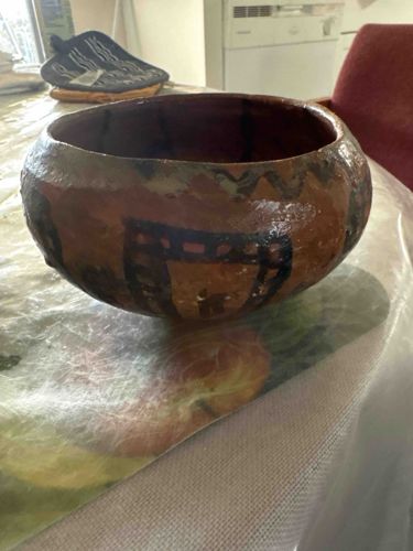 This item is a medium-sized, hand-built ceramic olla bowl, likely crafted from local red-earthenware clay. It features a bulbous, rounded body that tapers slightly toward an inward-curving rim. The exterior is decorated with folk-art style hand-painted motifs in dark brown or black pigments, including geometric ladder-like frames and a wavy 'serpent' or 'lightning' line around the top shoulder. The overall color palette is dominated by warm ochre, sienna, and terracotta tones, with a glossy glaze finish that appears unevenly applied, suggesting a artisanal or student-level production rather than high-end production. The construction shows irregular symmetry and a hand-pinched or coiled texture under the glaze, indicative of traditional pottery methods. Regarding condition, the piece shows significant signs of age and use, including surface crazing throughout the glaze, minor rim chips, and some fading of the painted pigments. There are visible dark scuffs and patches of patina that suggest the item may have been used or stored in a dusty environment. While no distinct maker's mark is visible from this angle, the style is reminiscent of 20th-century Southwest Native American inspired or Central American folk pottery. The craftsmanship is rustic, emphasizing utility and vernacular aesthetic over refined technical perfection.