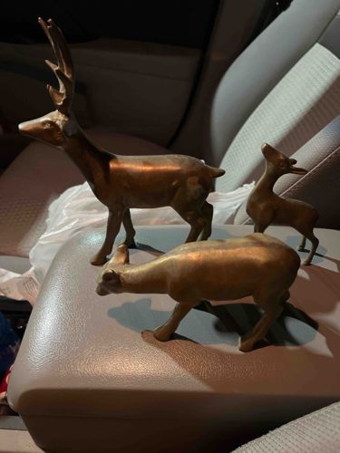 This is a set of three vintage cast brass figurines depicting a deer family, including a buck with prominent antlers, a doe in a grazing or downward-facing pose, and a small fawn with its head tilted upward. Each piece is constructed from solid brass, displaying a warm, golden-brown hue characteristic of aged metal. The buck is the largest, standing approximately 8 to 10 inches tall to the tip of its multi-tined antlers. The casting features mid-century modern aesthetic influences, characterized by smooth, somewhat stylized body contours and simplified facial features rather than hyper-realistic anatomical detail. Visible condition includes a significant aged patina with areas of darkening and minor oxidation (verdigris) typical for brass of this age, particularly in the recessed areas of the antlers and joints. There are minor surface scratches and small pit marks consistent with the sand-casting process. The underside likely contains seam lines from the molding process, and while no specific maker's mark is visible in the photo, these are consistent with mid-20th-century decorative imports, possibly from Korea or India, which were popular from the 1960s through the 1980s. The craftsmanship is solid, with a balanced weight that indicates high metal density and quality for home decor of that era.