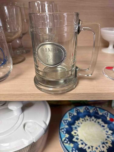 This item is a heavy-duty, clear glass beer stein featuring a cylindrical body with a flared, reinforced base for stability and a robust geometric handle. The glass construction is thick, characteristic of commercial-grade barware designed for durability. A prominent feature of this vessel is the oval pewter medallion affixed to the center-front of the mug. This medallion is embossed with the name 'DANIEL' in uppercase block lettering, positioned above a stylized graphic element which appears to be a nautical or familial crest. The metal shows a naturally aged patina with darkening in the recessed areas, enhancing the three-dimensional effect of the casting. The glass itself displays two horizontal ribbing accents near the brim and the base, adding a touch of traditional design. Condition-wise, the glass appears to be in good used condition with no visible cracks or significant chips, though there is minor surface clouding consistent with domestic washing and age. The pewter crest shows some minor surface scuffing but remains securely attached. This style of personalized barware typically dates from the late 20th century to the early 21st century and represents a common custom gift item valued for its utilitarian function and personalization.