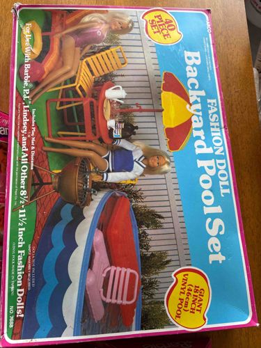 This is a vintage 40-piece toy playset titled 'Fashion Doll Backyard Pool Set,' manufactured by ARCO and licensed for use with dolls such as Barbie, P.J., and Lindsey. The set features a 'Giant' 18-inch (46cm) vinyl pool with a blue and white wave motif. Included accessories depicted on the box are a red-and-yellow striped patio umbrella, an orange lounge chair, a red patio table with various refreshments, a kettle-style grill, and a pink pool float. The box art displays dolls (not included) in typical early-to-mid 1980s fashion and hairstyles, suggesting the set dates to that period. The packaging shows significant signs of shelf wear and age-related distress, particularly along the corners and edges where the cardboard is scuffed and the color has rubbed away. There are visible creases on the main panel and some tearing at the top left corner. The item number is listed as NO. 7688, and it states the vinyl pool was made in Taiwan. Despite the box wear, the graphics remain vibrant, showcasing the era's saturated color palette of pink, turquoise, and yellow. This item represents a budget-friendly competitor to official Mattel brand accessories from the 1980s.