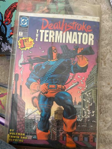 This is a first edition, issue #1 of the comic book series 'Deathstroke the Terminator,' published by DC Comics in August 1991. The cover features the character Slade Wilson (Deathstroke) in his iconic blue and orange tactical suit, wielding a rifle and bandolier against a city skyline background. The artwork is credited to Marv Wolfman, Steve Erwin, and Will Blyberg. The comic is a standard Bronze/Modern Age size, printed on glossy paper stock with a full-color cover. Notable markings include the '1st Take No Prisoners Issue!' yellow burst sticker, the DC logo, and the original $1.75 price point. Physically, the item appears in a protective plastic sleeve. While the user notes 'very good condition,' visible analysis shows slight blunting of the corners and some minor foxing/discoloration along the top white margin of the cover. The spine shows some minor stress marks (color breaks) consistent with careful reading. There are no signs of heavy creasing, water damage, or significant spine rolls. The colors remain vibrant without major fading, indicating limited UV exposure. This issue is historically significant as the launch of Deathstroke's first solo ongoing series, following his introduction in Teen Titans.