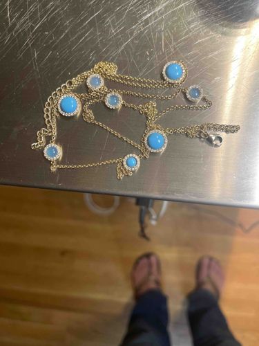 This is a delicate station-style necklace featuring alternating circular gemstone pendants set in a gold-toned metal, likely yellow gold or gold-plated sterling silver. The necklace incorporates seven distinct stations: four larger cabochon-cut vibrant turquoise stones and three smaller translucent light blue stones, possibly blue chalcedony or milky aquamarine. Each stone is encircled by a pav halo of small white stones, which appear to be diamonds or high-quality cubic zirconia, adding a brilliant contrast and sparkle to the design. The chain is a fine link cable style, featuring an adjustable extender chain at the clasp end to allow for varying lengths. The fastening mechanism is a standard lobster claw clasp. While no visible hallmarks are clear from the image, the craftsmanship suggests a contemporary fine jewelry design, possibly from a luxury boutique or designer brand. The condition appears excellent with no visible tarnishing or missing stones. The combination of opaque turquoise and translucent blue stones creates a sophisticated, Mediterranean-inspired aesthetic popular in modern jewelry trends from the 21st century.