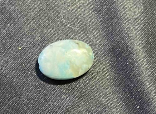 This item is an oval-cut cabochon gemstone, appearing to be Larimar (a rare pectolite). The stone exhibits a high-gloss, polished finish with a smooth, domed surface characteristic of a cabochon cut. Its color palette is composed of variegated shades of sky blue, pale turquoise, and milky white, creating the 'sea-and-sky' mottled pattern unique to Larimar. There are visible inclusions of light brownish-tan matrix near the top right edge, which is common for natural specimens. The stone's dimensions appear relatively small, suitable for a ring or pendant mount. Under inspection, the surface shows no major fractures or chips, indicating the stone has been well-maintained or is newly cut. The craftsmanship is evident in the symmetrical oval shape and the consistency of the polish across the convex surface. Larimar is exclusively found in the Dominican Republic, making the origin of the raw material geographically specific. This particular specimen lacks internal dark spotting (dendrites) often seen in lower grades, suggesting a medium-to-high quality decorative stone. No maker's marks or signatures are present as it is an unmounted loose gemstone.