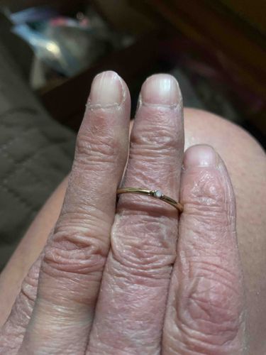 This item is a minimalist, delicate solitaire ring designed for stacking or wearing as a simple statement piece. The band is exceptionally thin, appearing to be approximately 1mm to 1.5mm in width, suggesting a contemporary or modern aesthetic. The ring is constructed from a yellow-toned metal, likely 10k or 14k yellow gold, though gold-plating or vermeil remains a possibility without internal hallmark inspection. It features a tiny, round-cut gemstone centrally mounted in a low-profile bezel or tension-style setting. The gemstone appears clear or white, possibly a small diamond, cubic zirconia, or white sapphire, exhibiting a subtle luster. The overall construction is smooth and polished, reflecting a refined but mass-produced level of craftsmanship. The condition shows moderate wear with light surface scratches and minor dulling of the metal's finish, consistent with regular use. There are no obvious signs of structural repairs or resizing. This style of 'whisper' jewelry became highly popular in the 2010s and remains a staple of modern boutique jewelry design. The lack of ornate detailing suggests it is intended for a youthful or minimalist market, prioritizing comfort and subtlety over traditional heft in fine jewelry.