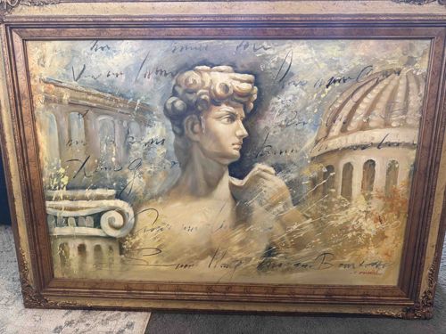 Neoclassical Collage Painting with Michelangelo's David and Classical Architecture