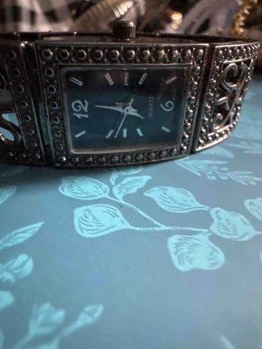 This is a contemporary ladies' cuff-style wristwatch featuring an antique-inspired aesthetic. The watch case is square with a black dial, featuring silver-tone Arabic numerals at the 12 and 6 o'clock positions, paired with baton index markers for the remaining hours. The dial is marked 'QUARTZ' and has three dauphine-style hands. The metal construction appears to be a base metal alloy with an antiqued silver-tone finish, designed to mimic vintage marcasite jewelry. The bezel and the flanking bracelet links are decorated with a repetitive beaded texture and decorative openwork filigree scrolls on the side panels. This piece likely dates from the late 20th to early 21st century. The condition shows moderate wear, including surface scratches on the crystal and some tarnishing or loss of the plating on the metal high-points. The craftsmanship is typical of mass-produced fashion jewelry, prioritizing style over horological complexity. It utilizes a common battery-operated quartz movement.