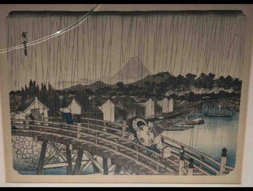 This item is a Japanese ukiyo-e woodblock print, attributed to the work of Utagawa Hiroshige, likely from the mid-19th century Edo period. The composition depicts a sudden rainstorm over the iconic Nihonbashi bridge with Mount Fuji looming in the background. Physically, the piece is printed on traditional washi paper, showcasing a muted color palette of indigos, grays, and earthy browns, which is characteristic of the landscape genre. The fine black lines representing the rain are a hallmark of the artist's atmospheric style. Notable features include the intricate rendering of figures with umbrellas crossing the wooden bridge and the architectural details of the surrounding storage houses (kura). The print shows visible signs of age including overall yellowing of the paper (toning), some fading of the lighter pigments, and a distinct horizontal crease or scratch across the upper third of the image. The artist's signature is visible in the upper left corner. The level of detail in the bridge's timber construction and the movement of the water indicate high-quality craftsmanship consistent with professional Edo-period woodcut production.