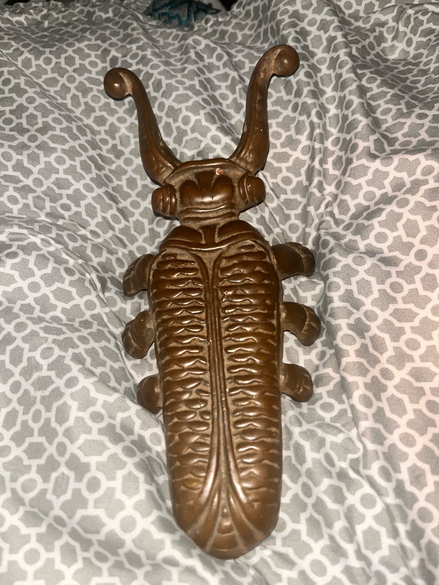 This item is a vintage decorative boot jack fashioned in the form of a stag beetle. It is constructed from heavy, solid cast brass and features a naturalistic brown-bronze patina consistent with age and use. The object measures approximately 9 to 10 inches in length. Its physical characteristics include two large, curved mandibles or antlers that serve as the grip for the heel of a boot, a segmented head with rounded eyes, and a long body detailed with textured elytra (wing covers) and six short, sturdy legs that provide elevation. The craftsmanship is of a high standard, showing detailed ribbing and sculptural depth that suggest a mid-20th-century production, likely influenced by Victorian hardware styles. In terms of condition, there is visible surface wear and oxidation typical for functional metalware. Small scratches and minor pitting are present across the surface, and a noticeable drop of light-colored residue (possibly paint or wax) is located on the head section. No maker's marks are visible in this view, though such items were commonly produced in the UK and USA. The piece remains structurally sound with no evidence of cracks or structural repairs, making it both a functional tool and a collectible piece of entomological-themed decor.