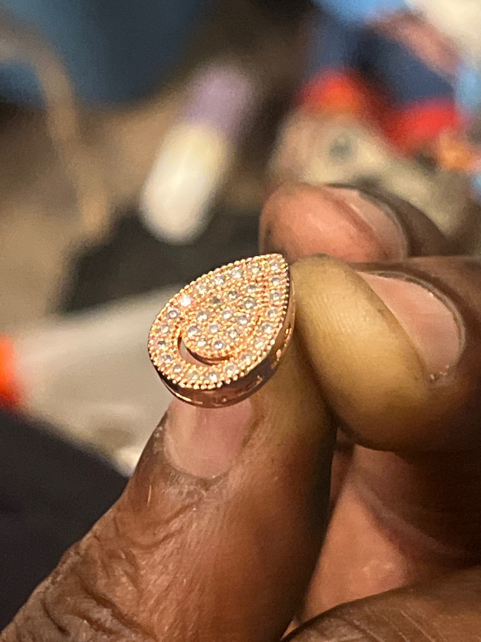 This item is a decorative teardrop or pear-shaped charm, likely intended for use as a pendant or a high-end earring component. The piece is constructed from a metal with a rose-toned finish, suggesting it is either 14k/18k rose gold or a plated alternative. The front face is densely set with numerous small, round-cut colorless stones in a pavé or micro-pavé style. The stones appear to be high-quality CZs or small diamonds, exhibiting significant sparkle. Notably, there is a distinct curved 'cut-out' or recessed segment within the pavé field, which suggests a modern, stylized design element, possibly representing a crescent or a part of a logo. The side of the charm shows a polished finish with a slightly rounded profile. There are clear openings on the lateral side, indicating it is a 'slider' style bead or charm designed to be threaded onto a chain. The craftsmanship is contemporary, with even stone settings and a smooth outer rim. Small indentations along the perimeter may serve as a milgrain-effect border. No hallmarks or maker's marks are visible on the outer surface from this angle. The item appears to be in good used condition with only minor surface scratches consistent with handling.