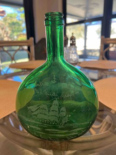 Etched Green Glass Onion Bottle with Maritime Motif