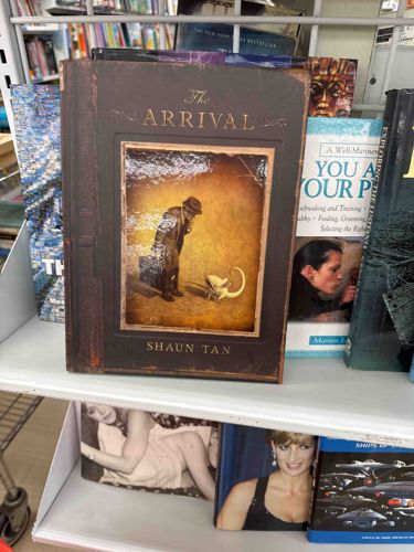 This is a hardcover edition of the wordless graphic novel 'The Arrival', authored and illustrated by Shaun Tan. The book is designed with a unique aesthetic intended to mimic a vintage, battered scrapbook or weathered photo album. The cover features a dark brown, faux-leather appearance with printed 'wear' and 'scuffing' along the edges as part of its artistic design. Centered on the front cover is an inset illustration depicting a man in a hat holding a suitcase, looking down at a small, fantastical creature against a sepia-toned background. The title 'THE ARRIVAL' is printed at the top in a gold-colored serif font, with the author's name 'SHAUN TAN' at the bottom. Regarding condition, the book shows actual physical wear consistent with secondary market retail, including distinct shelf wear, bumping at the corners, and minor peeling or fraying of the paper laminate on the spine and corners. There are visible white scuff marks on the central illustration plate, likely from contact with other books. The interior pages are not visible, but this specific work is known for its high-quality, sepia-toned illustrations on heavy-stock paper. Originally published in 2006, this edition exhibits the standard size of a large-format graphic novel.