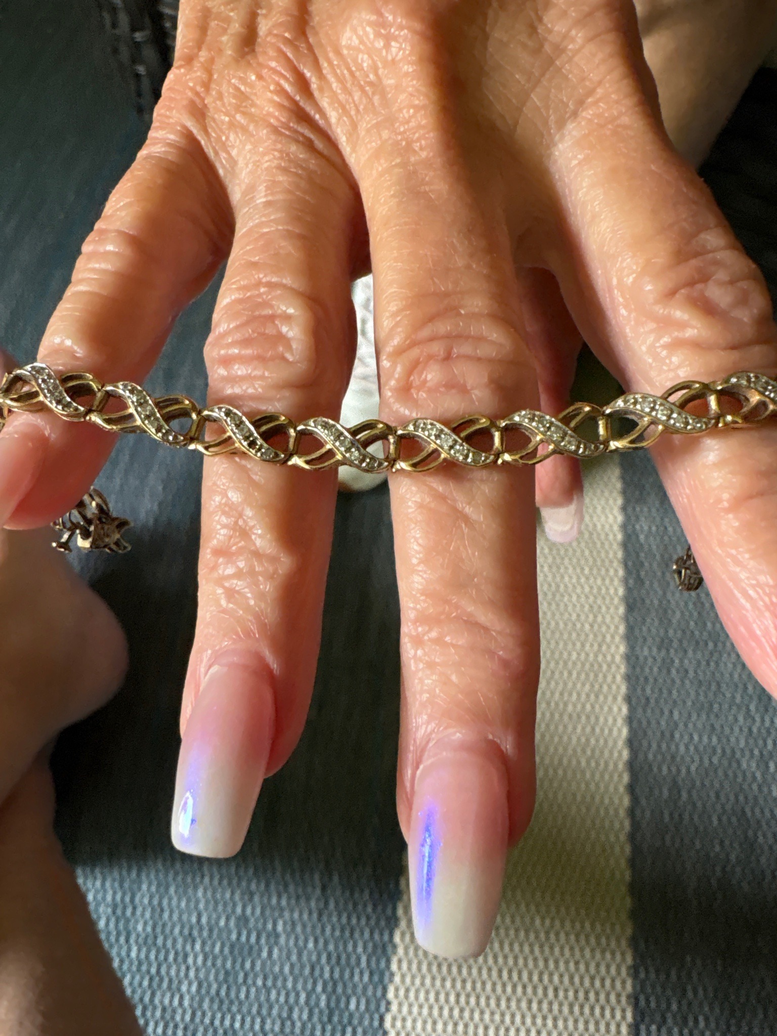 This is a fine jewelry link bracelet characterized by a repeating 'infinity' or figure-eight motif. The bracelet is constructed from what appears to be yellow gold, possibly 10k or 14k based on the common market variety for this specific style. Each infinity link is articulated and features a delicate criss-cross design where one side of the ribbon is smooth polished gold and the alternating side is pavé-set with small round decorative stones, likely diamonds or high-grade cubic zirconia. The stones are set in a rhythmic pattern that gives the piece a continuous sparkle. The craftsmanship shows mass-market fine jewelry production typical of the late 20th to early 21st century. The condition appears well-maintained, though there is visible surface patina and minor accumulated grime between the settings and link joints, suggesting regular wear. No missing stones are immediately apparent from the primary perspective. The item features a safety chain visible on the distal ends, which is a significant quality indicator designed to prevent loss should the primary clasp fail. The overall aesthetic is classic and feminine, representative of 'everyday luxury' styles found in major retail jewelers.