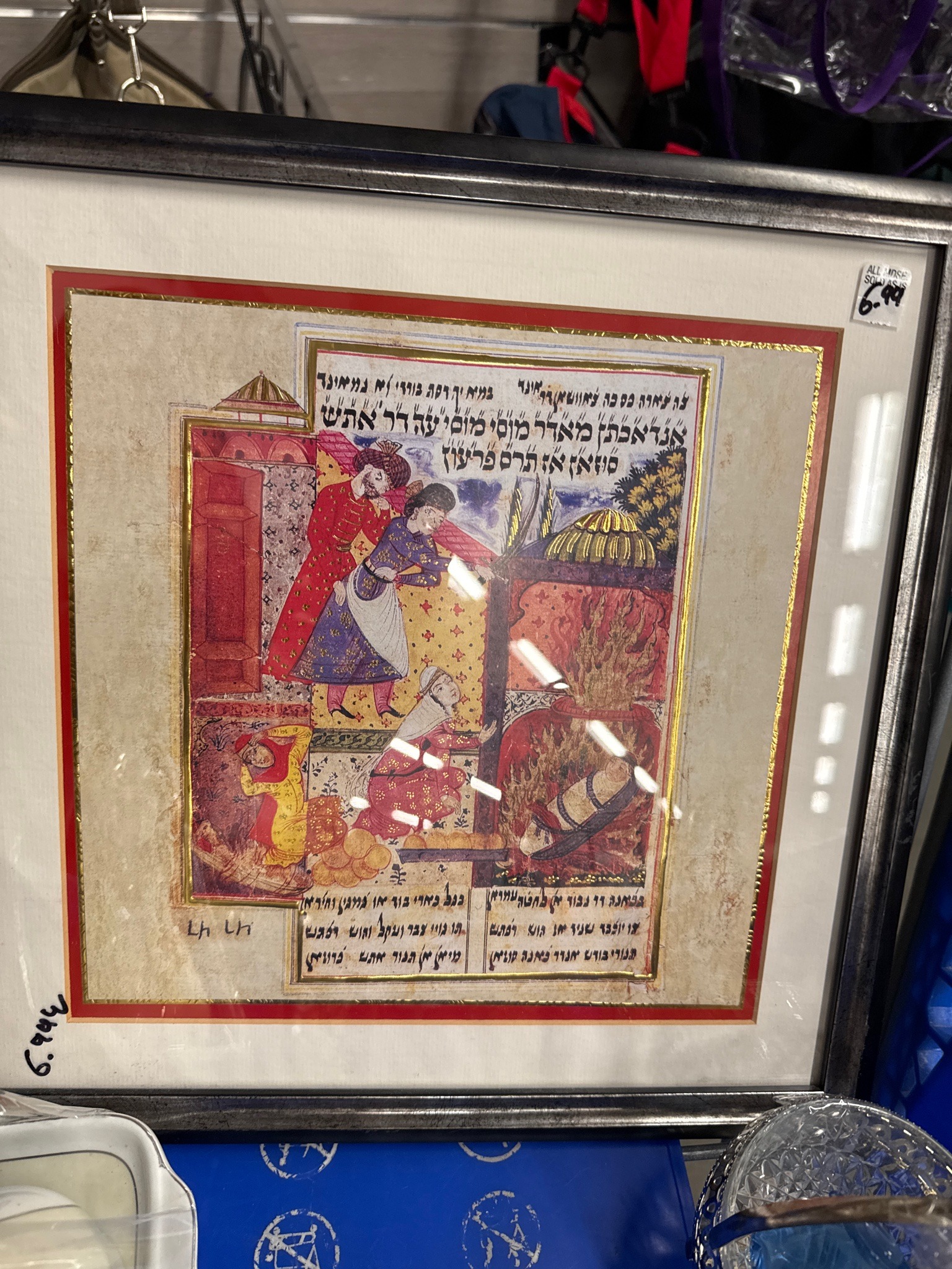 This item is a framed decorative print depicting a scene from a Judeo-Persian illuminated manuscript, possibly inspired by the Ardashir-nama or similar 17th-18th century Epic poetry. The artwork features traditional Persian miniature styling with central figures in vibrant red, blue, and gold-patterned traditional robes. The scene appears to depict a dramatic biblical or legendary narrative involving a figure in a furnace or fire, characteristic of the story of Abraham or similar themes found in Judeo-Persian literature. The text is written in Hebrew script but represents the Persian language (Judeo-Persian). The print is mounted on a cream-colored mat with a red and gold double border, housed in a contemporary silver-toned frame. Physically, the print mimics the texture of aged parchment. Notable details include the gold-leaf effect on the architecture and clothing patterns. The condition appears fair, though it is a modern reproduction rather than an original manuscript leaf, indicated by the uniform surface and modern framing. There are visible price tags ($6.99) and markings on the frame and glass, suggesting it was sourced from a secondary market or thrift environment. The craftsmanship of the original design shows high-quality classical Persian influence, while the print quality appears standard for decorative home goods.