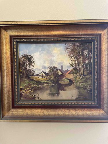 This is a framed impressionist-style landscape painting, likely oil on canvas or board, depicting a tranquil European-style countryside scene. The composition features a slow-moving body of water in the foreground, reflecting the soft, clouded sky above. A stone arch bridge spans the water in the middle ground, leading toward a small cluster of cottages with gabled roofs. The brushwork is expressive and painterly, utilizing a palette of earthy greens, ochres, and muted blues to convey a sense of atmosphere and light. The work is housed in a substantial, multi-tiered gilded wood frame with a dark inner liner and beaded decorative accents. The frame exhibits a distressed or crackle-glaze finish, typical of late 20th-century traditional framing techniques intended to evoke an aged appearance. An illegible signature is visible in the lower right corner, executed in a dark pigment that blends with the foreground shadows. The overall condition appears to be excellent with no visible craquelure, paint loss, or significant damage to the ornate frame. The style suggests a contemporary artist working in the 19th-century European landscape tradition, possibly from the late 20th or early 21st century.