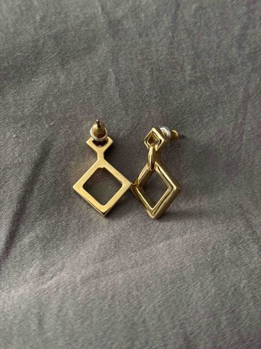 These are a pair of geometric drop earrings featuring a distinctive double-diamond motif. The construction consists of a small, solid diamond-shaped post at the top which connects to a larger, open-frame hollow diamond drop via a small integrated hinge or loop. The items appear to be made of a polished gold-toned metal, likely brass or a similar alloy with gold plating, given the warm yellow hue and the visible wear on the friction backings. The larger diamond drops are approximately 1.5 to 2 centimeters in length. Regarding condition, the earrings show signs of moderate use; there is some light surface scratching and dulling of the polish, particularly on the edges. The earring backs show more significant discoloration and oxidation, which is common for costume jewelry of this type. No visible maker's marks or hallmarking are discernible from the image, suggesting mass-production. Stylistically, the sharp angles and minimalist aesthetic align with late 20th-century contemporary designs, possibly from the 1980s or 1990s. The craftsmanship is standard for commercial fashion jewelry, with clean mold lines and functional articulating joints.