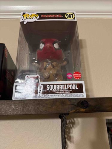 This is a Funko Pop! vinyl bobble-head figure depicting 'Squirrelpool,' a squirrel version of the Marvel character Deadpool. The figure is numbered 967 in the Marvel series. It features a unique 'flocked' texture, meaning it has a soft, fuzzy coating over the vinyl body to simulate fur. The squirrel is wearing Deadpool's signature red and black mask and harness. The item is housed in its original window box packaging, which includes a clear plastic protector. Notable markings include a pink 'Flocked' sticker and a red 'GameStop Exclusive' sticker on the front window. The box displays the stylized character art on the bottom left and the name 'SQUIRRELPOOL' in bold white text against a wood-grain patterned background. Regarding condition, the box appears to be in very good to mint state, showing sharp corners and clean edges through the protective sleeve. There are no visible signs of sun fading or water damage. This collectible dates from approximately 2021-2022 and represents a niche crossover character highly sought after by Marvel and Funko completionists due to its exclusive retail status and specialty finish.