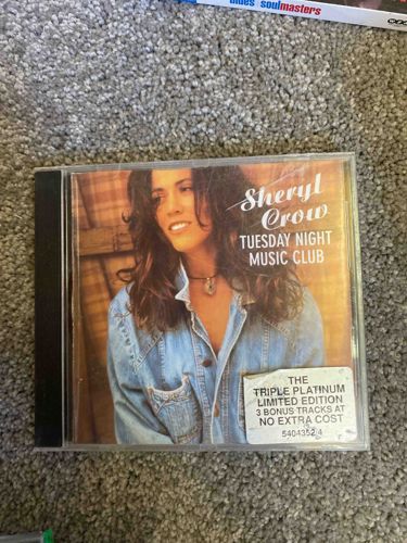 This is a physical Compact Disc (CD) of Sheryl Crow's debut studio album, 'Tuesday Night Music Club,' originally released in 1993. This specific unit is a 'Triple Platinum Limited Edition' version, identifiable by the white hype sticker on the lower right corner of the clear plastic jewel case. The sticker notes the inclusion of 3 bonus tracks at no extra cost and displays the serial number 5404352/4. The cover art features a portrait of Sheryl Crow in a denim jacket against a rustic wooden background, utilizing warm, sepia-toned hues. The item is housed in a standard 5-inch clear polystyrene jewel case with a black plastic tray on the left spine side. Regarding condition, the jewel case shows visible surface scuffing and fine scratches consistent with age and handling. There is a notable crack in the plastic towards the top left edge. The hype sticker is aged with yellowing, slightly peeling edges, and some minor stains, suggesting it has been in storage for some time. The artwork insert appears intact, though slightly misaligned within the case. This edition represents a mid-90s re-release following the album's massive commercial success, making it a nostalgic piece of pop-rock history.