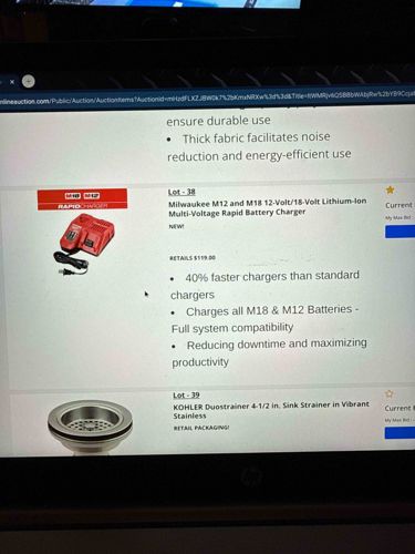 This item is a Milwaukee M12 and M18 12-Volt/18-Volt Lithium-Ion Multi-Voltage Rapid Battery Charger, appearing as Lot 38 in an online auction listing. The unit features a distinct high-visibility red impact-resistant plastic housing, characteristic of the Milwaukee brand aesthetic. The design includes two specific dock ports: one for M12 compact batteries and one for larger M18 slide-style batteries. It is equipped with a black, heavy-duty insulated power cord and a standard two-prong electrical plug. According to the listing, the device is in 'New' condition, indicating a lack of physical wear, scuffs, or surface patina usually found on used power tool accessories. Notable functional features highlighted include its ability to charge batteries up to 40% faster than standard sequential chargers. The construction includes integrated ventilation slots for heat management during rapid charging cycles and LED status indicators to communicate charging progress. The item represents modern professional-grade power tool charging technology designed for compatibility across two proprietary battery systems, maximizing job site productivity by reducing downtime. The retail evaluation provided in the listing is $119.00, reflecting its status as a premium 'Rapid' variant rather than a base model charger.