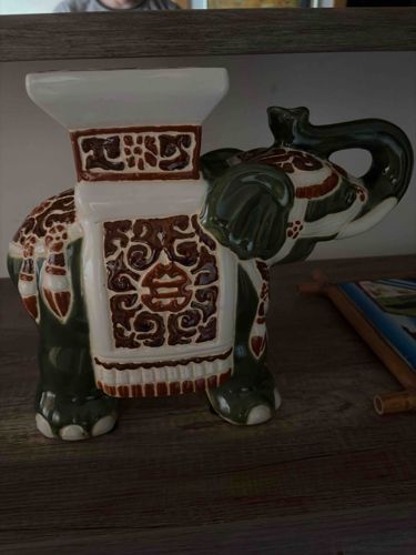 This item is a decorative ceramic elephant, designed in the tradition of a Chinese garden stool or plant stand. The piece measures approximately 10 to 14 inches in height and is constructed from glazed stoneware or porcelain. It features a three-color palette consisting of a deep forest green, a creamy off-white base, and reddish-brown (sienna) decorative relief work. The elephant is depicted in a standing position with its trunk raised in a gesture of good luck. It is adorned with an elaborate ceremonial harness and a rectangular Howdah-style flat seat on its back, which is intended for supporting flower pots or small decorative objects. The ornamentation includes geometric fretwork on the seat base, stylized floral motifs on the head, and a large central panel on the side featuring traditional scrollwork. The glaze appears thick and glossy, though there are visible signs of age consistent with the provided 16-year minimum, including minor surface dust in recessed areas and slight variations in the pigment saturation. The overall craftsmanship suggests a mass-produced decorative piece, likely from the late 20th century or early 2000s, designed to mimic Ming or Qing dynasty garden furniture styles. No visible cracks or major chips are apparent in the image, indicating it has been well-maintained as an indoor decorative element.