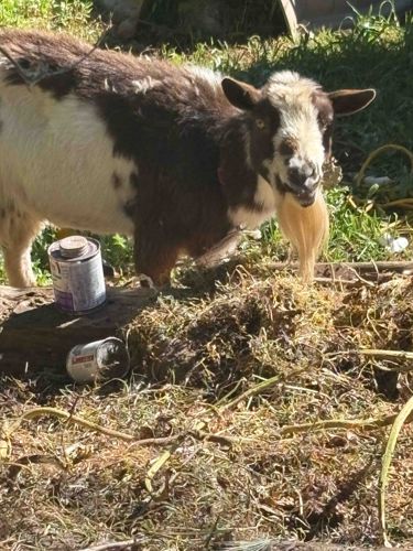 This living specimen is a domestic goat, appearing to be an adult buck or wether, possibly of a mixed Alpine or Nigerian Dwarf lineage based on its medium build and physical proportions. The animal exhibits a tri-color coat pattern, predominantly featuring large white patches combined with dark brown and black markings across the torso and face. A highly distinguishing physical feature is the long, light-blonde or cream-colored beard originating from the chin, which is thick and well-developed, suggesting maturity. The facial structure shows a prominent white blaze down the center of the muzzle, flanked by dark brown around the eyes and ears. The ears are small to medium-sized and alertly positioned. The coat appears somewhat coarse and shaggy, typical of outdoor livestock in a natural environment. Visible condition indicators include slight matting of the fur and dirt accumulation consistent with forage activities. The animal is located in an outdoor rural setting with dry vegetation and discarded metal canisters nearby. Its posture is upright and attentive. There are no visible breeder tags or tattoos in the image to indicate specific registered lineage or farm manufacturing details.