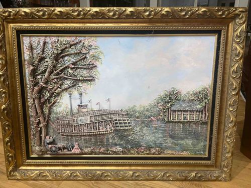This piece is a highly detailed, hand-crafted 3D bas-relief diorama presented in a lavish, ornate gold-finished frame. The scene depicts an 19th-century-style paddle-wheel steamboat navigating a river, flanked by a large overhanging tree with textured bark and foliage on the left, and a riverside cottage or boathouse nestled in greenery on the right. The artwork is constructed using mixed media to create significant depth, with the tree branches and the boat itself physically protruding from the background. The color palette consists of muted pastels, including soft blues for the sky and water, and various shades of green and brown for the landscape. The steamboat features intricate architectural details such as railings, twin smokestacks, and deck levels. In the lower-left foreground, a small horse-drawn carriage and figures add a sense of scale and historical narrative. The frame is wide and features a repetitive acanthus leaf flourish with a beaded inner border and a black velvet-style liner. Condition appears generally good, though there is visible light dust accumulation in the crevices of the relief and minor age-related wear or light scuffing on the gilded frame's surface. A signature is present in the lower right corner, though it is not clearly legible from the primary view. The work likely dates to the late 20th century, drawing inspiration from Americana and Southern folk art traditions.