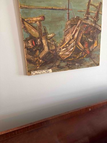 This is an original oil painting on board or canvas titled 'Fishing Village,' dated 1960. The artwork is created in a Mid-Century Modern Expressionist style, characterized by heavy impasto and visible, vigorous brushstrokes that give the piece a sculptural, three-dimensional quality. The color palette is dominated by earthy browns, ochres, and muted yellows against a pale teal or sea-foam green sky. The composition depicts the weathered hulls of fishing vessels in a harbor, with a focus on their structural skeletal forms and worn surfaces. A small white label affixed to the bottom left corner identifies the work: '1960 "FISHING VILLAGE" BY YOSHIKA IEZUMI $50.00'. The work appears to be unframed, showing raw edges where some paint has slightly chipped or worn away, consistent with its age. There is significant texture throughout the piece, particularly on the darker pigments used to define the boats, which adds depth and a sense of ruggedness to the maritime scene. The painting reflects the influence of post-war Japanese-American modernism, balancing representational subject matter with abstract, textural execution. Condition appears fair for its age, though the prominent surface texture may have collected dust in the crevices over time, and the corners show minor blunting typical of unframed board work.