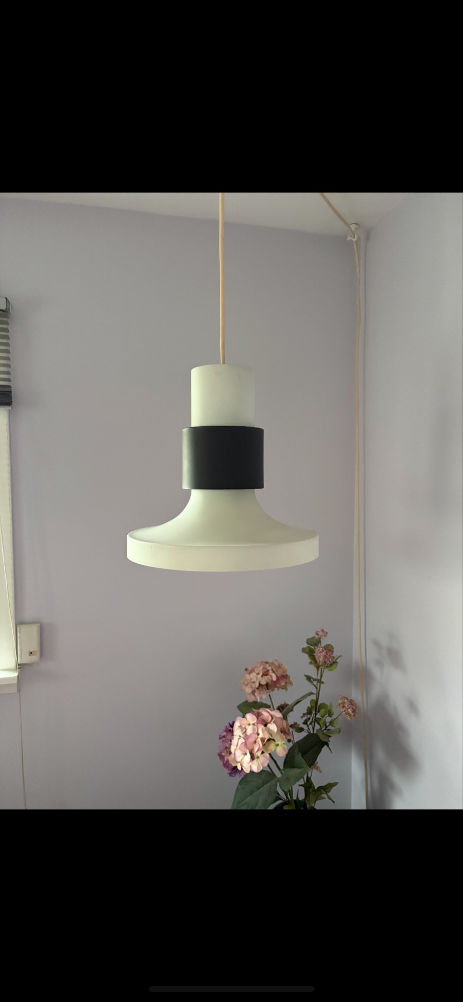 This item is a modernist pendant light fixture, characterized by its sleek, geometric silhouette and bi-tonal contrast. It features a trumpet-shaped body crafted from translucent white matte acrylic or frosted plastic, which serves as a large diffuser for soft, ambient lighting. The body is cinched at its mid-section by a bold, black cylindrical metal band, possibly aluminum or steel, which provides a striking visual accent and likely houses the bulb socket assembly. The fixture is suspended by a cream-colored fabric-wrapped electrical cord, typical of mid-to-late 20th-century European designs, specifically those from the 1960s or 1970s. The design exhibits hallmarks of Scandinavian or Italian minimalism, where functionality meets sculptural form. Notably, the shade flares significantly at the base into a wide, shallow direct-light aperture. Regarding condition, the acrylic shade appears well-preserved with no visible cracks or yellowing, though fine surface scuffs may be present upon close inspection. The black band retains a consistent matte finish. The suspension cord shows some minor slack and aging but appears intact. The piece represents high-quality industrial design from the mid-century period, emphasizing clean lines and the play of light through polycarbonate/acrylic materials.