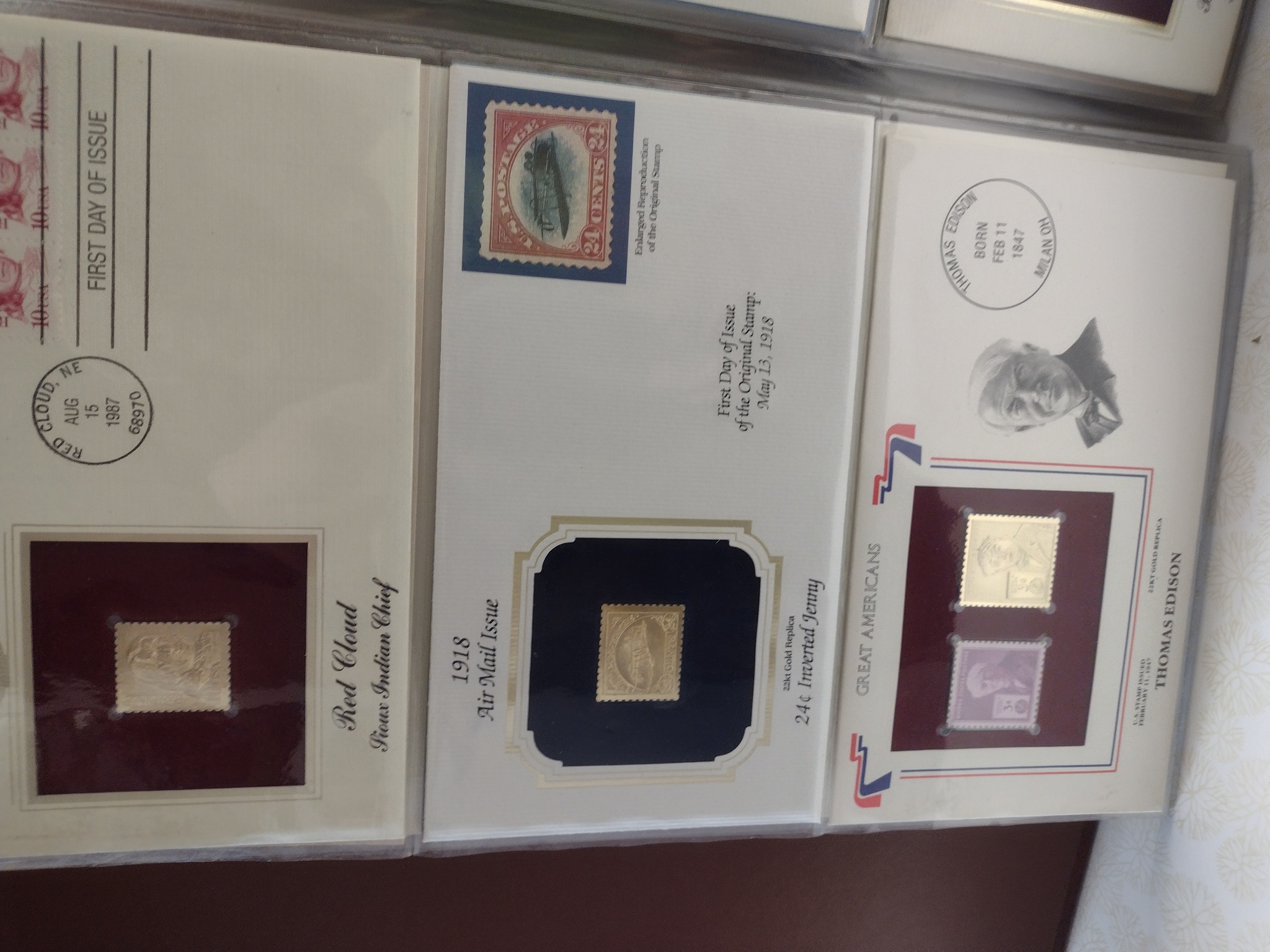 This item is a collection of philatelic commemorative covers featuring 22kt gold foil stamp replicas, typically produced by the Postal Commemorative Society. The collection is presented on high-quality cream-colored cardstock, with each cover housed in a protective clear plastic sleeve and mounted within an album. The central piece shown is the 1918 Air Mail Issue '24c Inverted Jenny' commemorative, which includes an enlarged color reproduction of the famous error stamp and a 22kt gold foil embossed replica set against a dark navy blue background within a decorative gold-bordered frame. To the left is a 'Red Cloud, Sioux Indian Chief' cover with an August 15, 1987, postmark from Red Cloud, NE. To the right is a 'Thomas Edison' cover from the 'Great Americans' series, featuring a gold replica alongside a standard 3-cent purple stamp. The materials consist of heavy archival paper, gold-plated foil, and standard adhesive stamps. The condition appears to be 'Excellent' or 'Near Mint' with no visible signs of foxing, toning, or handling wear. These collectibles were popular in the late 1970s and 1980s, marketed for their aesthetic and thematic appeal rather than for postage use. The craftsmanship is evident in the precise embossing of the gold foil and the clean typography of the descriptive text.