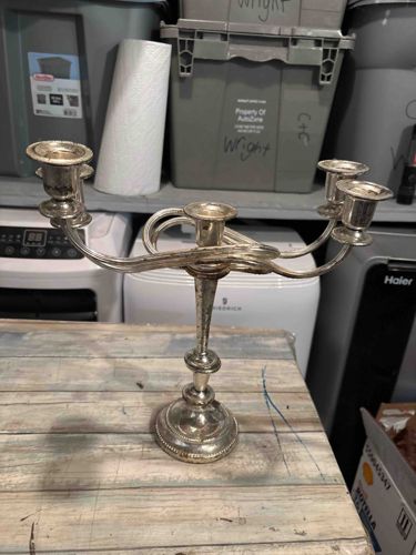 This is a five-light silver-plated candelabrum featuring a central candle nozzle and four curved, spreading arms that terminate in matching candle cups. The piece is constructed with a circular, weighted base decorated with a beaded or gadrooned rim edge. The central tapering column features simple turned knops leading to a detachable branch section. The arms exhibit a graceful, sweeping scroll design, typical of Neo-Classical or Mid-Century traditional styles. Based on the visible surface wear and oxidation, the item appears to be mid-20th-century silver plate rather than solid sterling silver. There is significant tarnishing and areas where the silver plating may be thinning (pitting or 'bleeding'), particularly along the central stem and within the cups. No maker's mark is immediately legible from the primary image, though such pieces often carry marks like 'EPC' (Electroplated Copper) or 'Leonard' on the underside. The construction is modular, allowing the top branch section to be removed to convert the piece into a single candlestick. The overall condition shows signs of moderate use and environmental exposure, requiring professional polishing to restore its luster.