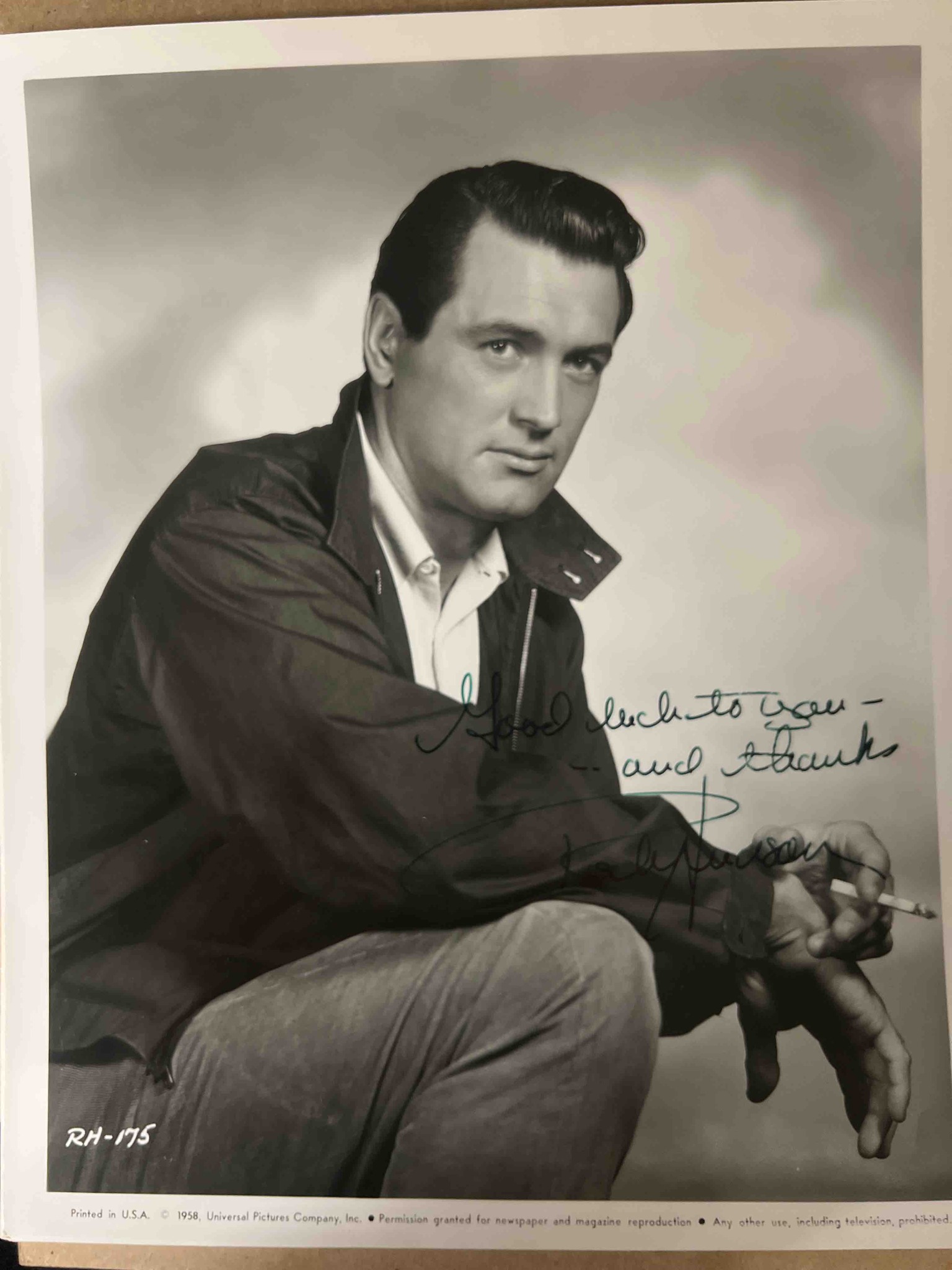 This is a vintage black-and-white promotional still featuring Academy Award-nominated actor Rock Hudson, produced by Universal Pictures Company in 1958. The photograph measures approximately 8x10 inches and shows Hudson in a mid-profile pose, wearing a zippered jacket over an open-collar shirt while holding a lit cigarette. A printed production code 'RH-175' is visible in the bottom left corner within the image area. The lower white margin contains official studio text: 'Printed in U.S.A. © 1958, Universal Pictures Company, Inc.' and standard legal permissions for media use. Centered horizontally across the middle of the image is a personalized inscription and autograph in dark blue or black ink, which reads: 'Good luck to you - and thanks Rock Hudson'. The signature is bold and fluid, typical of Hudson's hand from this period. The item appears to be in excellent aesthetic condition with sharp detail and high contrast. The paper exhibits minimal yellowing, and the margins appear crisp without significant creasing or tears, though professional authentication of the ink signature would be required to confirm it is hand-signed rather than a high-quality reproduction or pre-print.