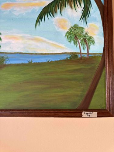 This is an original representational oil or acrylic painting on canvas, housed in a simple dark brown wood-grain frame. The composition depicts a serene tropical coastal scene, featuring a grassy foreground that leads to a narrow body of water, likely a bay or lagoon, with a distant treeline. The right side of the frame is dominated by a large, arching palm tree trunk, while two smaller palms stand in the middle ground. The sky is rendered with soft blues and white clouds tinged with yellow and orange, suggesting early morning or late afternoon light. The brushwork appears somewhat loose and vernacular, leaning toward a folk art or amateur naturalist style rather than high-realism. In the lower right-hand corner, there is a visible artist's signature or monogram that looks like 'Del' followed by a date, possibly '1997'. The painting's condition appears stable, though there is a small piece of masking tape on the lower frame edge with handwritten notes ('Signed 45.'). The frame is a modern, mass-produced profile with a deep cove design. The scale appears medium-sized, likely intended for residential decor. This piece captures a generic Florida or Caribbean-style atmosphere, characteristic of regional hobbyist art from the late 20th century.
