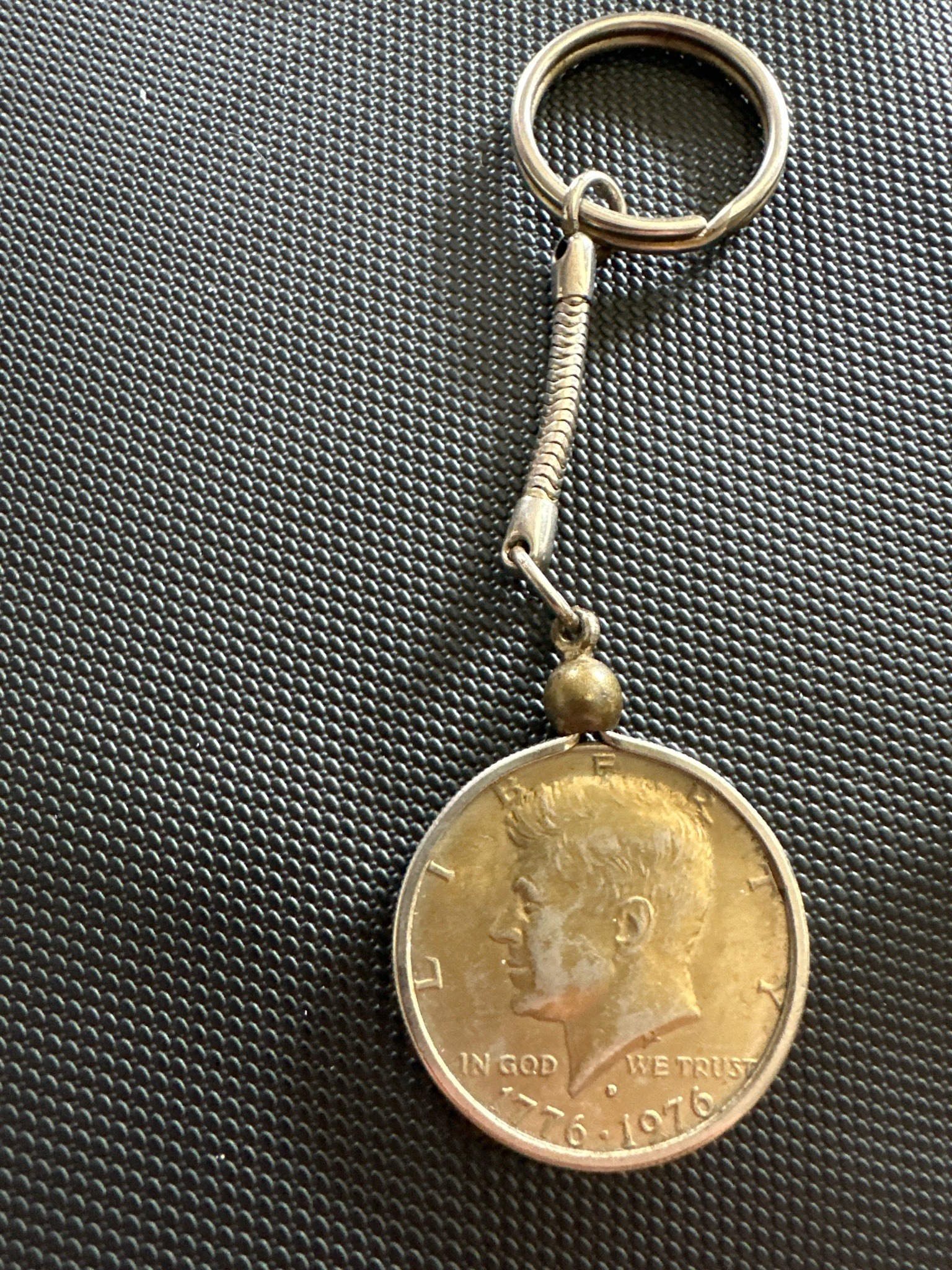This item is a commemorative keychain featuring a United States Bicentennial Kennedy Half Dollar as the central pendant. The coin is a circulating commemorative issue dated 1776-1976, featuring the profile of President John F. Kennedy on the obverse. It is housed in a polished silver-toned metal bezel that encircles the coin's edge, secured at the top by a ball-and-pin swivel attachment. The coin appears to have a Denver mint mark ('D') visible below Kennedy's neck. The attachment leads to a flexible metal snake-style chain, which is then connected to a standard split-ring key holder. Physically, the coin shows significant signs of age and handled wear, most notably heavy gold-toned or yellowish tarnishing/toning across most of its surface, though some original silver coloring remains on the high points of the profile. There are visible surface abrasions, minor scuffs, and a general loss of luster consistent with use as an everyday carry item. The bezel and chain mechanisms show signs of oxidation and patina but remain structurally intact. This piece likely dates from the mid-to-late 1970s, produced as a souvenir to celebrate the American Bicentennial. The overall craftsmanship is commercial grade for the era, designed for durability rather than high-end jewelry standards.