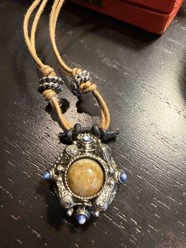 This piece of jewelry features an ornate, heavy-set pendant that blends elements of tribal and bohemian aesthetics. The central focal point is a large, rounded cabochon, likely honey calcite or a similar variegated stone with warm beige and brown marbling. This stone is set within a complex, silver-toned metal housing, which exhibits significant oxidation or intentional patination in its recessed areas to highlight the intricate scrollwork and filigree-style details. The pendant is further embellished with smaller, round blue-and-white marbled beads, possibly sodalite or ceramic, positioned at cardinal points around the frame. The construction appears to be cast metal with hand-assembled components. The pendant is suspended by a thick, tan-colored leather or suede cord that is double-looped through the top. This cord is accented with silver-toned rope-texture sliders. While no clear maker’s mark is visible in the photograph, the style and heavy casting suggest a contemporary piece influenced by traditional ethnographic jewelry. In terms of condition, there is minor fraying on the cord near the knots and some dulling of the metal surface consistent with wear, but no major structural damage or missing stones are evident. The craftsmanship belongs to the mid-to-high decorative jewelry tier, focusing on visual impact and textured materiality.