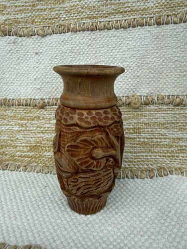 This item is a medium-sized decorative vase, expertly hand-carved from a single block of dense, medium-toned hardwood. The vessel features a flared, smooth rim and neck that transitions into a highly textured cylindrical body. The central decorative section showcases high-relief carvings of large floral motifs and leaves, characterized by deep gouging and scalloped patterns that create a three-dimensional effect. Above the floral band is a ring of stippled or 'honeycomb' indentations, while the base is finished with vertical fluting. The wood displays a natural warm grain with a possible light wax or oil finish that has aged to a soft patina. Notable features include the artisanal tool marks visible within the carved recesses, suggesting folk art or traditional handicraft production, likely from the mid-to-late 20th century. The condition appears fair to good, with some visible drying cracks (checking) near the rim and base, which are common to solid wood items of this age. There are minor abrasions and surface dust consistent with shelf display. No specific maker's marks or signatures are visible in the primary view. The quality of the carving indicates significant skill, particularly in the layering of the botanical elements.