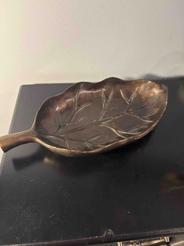 This is a decorative valet tray or dish cast in the organic shape of a leaf, likely tobacco or a large elm leaf. The item is constructed from solid metal, most consistently appearing to be cast brass with a dark, hand-rubbed bronze patina finish. It features a shallow, oblong basin with raised, undulating edges that mimic the natural curl of a real leaf. The interior surface displays detailed cast-in relief work representing the primary and secondary veins (midrib and lateral veins), adding significant texture and realism to the piece. The handle is stylized as a thick, short stem extending from the base of the leaf. In terms of dimensions, it appears to be a medium-sized accent piece, likely measuring between 8 to 12 inches in length. The construction is heavy and substantial, indicative of a quality casting process rather than thin stamped metal. The color is a deep, burnished brown with glints of gold-toned brass showing through on high-wear areas and edges, which is a desirable aging characteristic. Condition-wise, the tray shows light surface wear, minor oxidation, and a few small scuffs consistent with mid-century to late 20th-century decorative objects. There are no visible maker's marks from this angle, but the style is reminiscent of Hollywood Regency or Brutalist interior decor from the 1960s or 1970s. The underside likely rests on three or four small cast feet or a flat base integrated into the leaf's form.