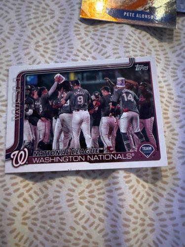 This is a standard 2.5 by 3.5-inch licensed baseball trading card from the 2020 Topps Series 1 collection, featuring the Washington Nationals. The landscape-oriented card celebrates the team's victory following their 2019 World Series championship. The card stock is a traditional semi-glossy paperboard. The front image depicts a celebratory huddle of players in their gray road uniforms, with visible jersey numbers including #9 and #14. The design includes the 'WSH' abbreviation on the left border, the Washington Nationals 'W' logo on the bottom left, and the 'Topps' brand logo in the upper right. A 'Team Card' diamond emblem is positioned in the bottom right corner. The color scheme is dominated by the team’s signature colors: patriotic red, navy blue, and white. In terms of condition, the card appears to be in raw, ungraded state. While the corners look relatively sharp from this angle, there is a visible slight fraying or whitening on the bottom center edge. The centering of the image within the white borders appears slightly shifted toward the top left. No major creases, staining, or surface scratches are immediately apparent, though fine surface wear is common for cards not stored in protective sleeves.
