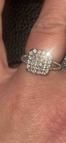 This is a contemporary cluster-style engagement ring, likely crafted from 10K or 14K white gold or sterling silver. The centerpiece is a squared composite head featuring a central cluster of round brilliant-cut diamonds. This center arrangement is surrounded by a single halo of larger round diamonds, creating a tiered rectangular or 'princess style' silhouette. The ring features a split-shank shoulder design, which is also pav-set with small accent diamonds that extend approximately halfway down the band. The metal appears polished and bright, typical of rhodium plating over white gold. Regarding condition, the piece appears to be in well-worn but generally good condition; however, there is a visible yellowish tint on the lower part of the split shank, which may indicate the rhodium plating is wearing thin, exposing the natural yellow color of the underlying gold alloy (a common maintenance requirement for white gold). The prongs appear intact, though one area of the halo shows a significant light reflection that could obscure specific prong wear. The craftsmanship is consistent with modern commercial jewelry manufacturing from the late 20th to early 21st century. No maker's marks or hallmarks are visible in the photograph, but the style is characteristic of major retail jewelers like Zales or Kay Jewelers.