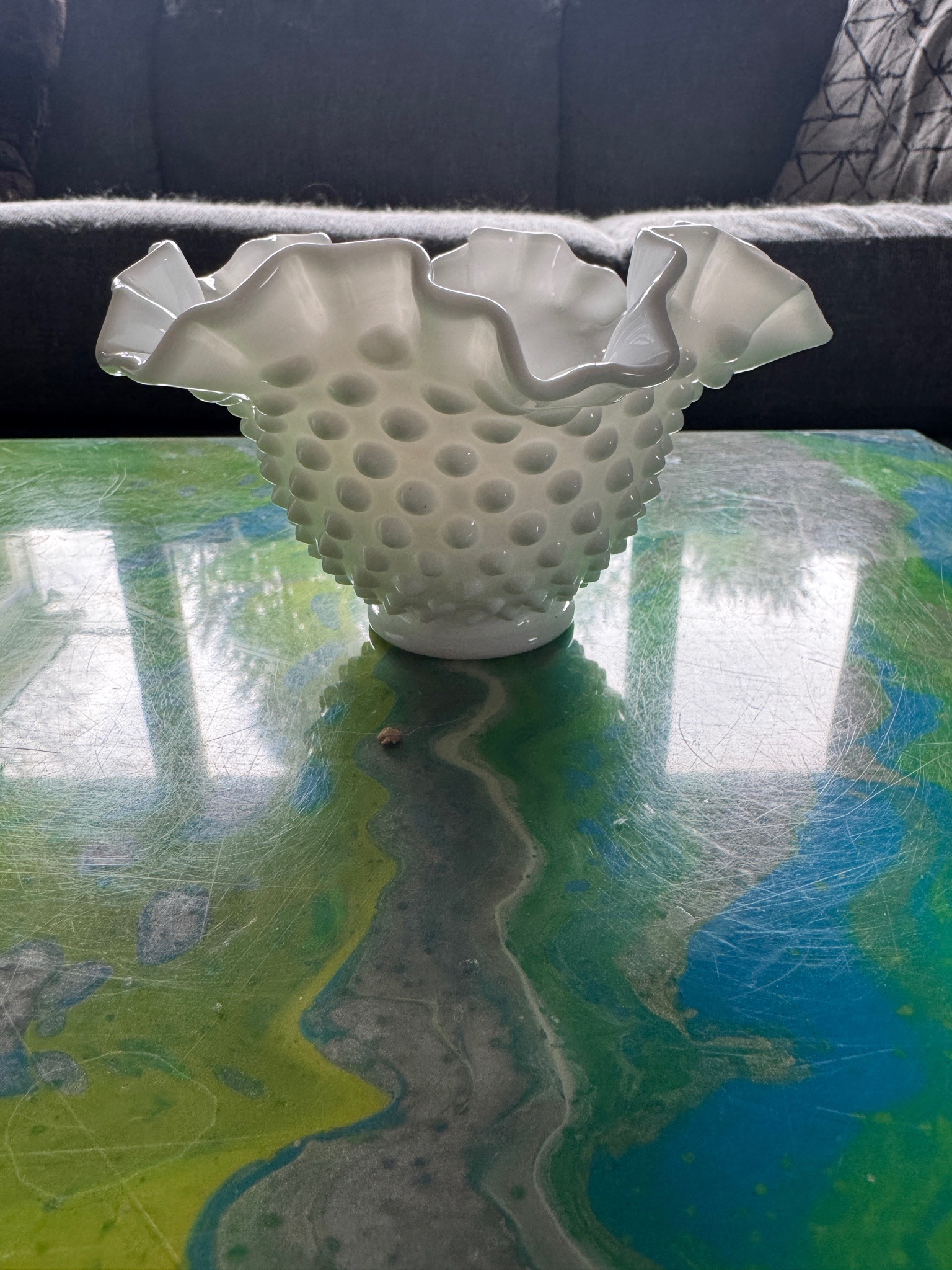 This item is a classic milk glass bowl produced by the Fenton Art Glass Company, likely dating from the mid-20th century (circa 1950s-1970s). The bowl features the signature 'hobnail' pattern, characterized by a uniform field of raised, rounded bumps across the exterior surface. The upper rim is finished with a wide, deeply crimped or ruffled edge, creating a dynamic, undulating silhouette. The glass is an opaque, bright white 'milk' color with a smooth, semi-glossy finish on the interior. It sits on a low, circular pedestal base which provides stability. The craftsmanship displays high-quality molding with consistent hobnail spacing and expert glass manipulation at the ruffled rim. Based on the visual inspection, the item appears to be in excellent vintage condition with no visible chips, cracks, or significant staining. There is a slight translucency at the thinnest points of the ruffled edges, which is a characteristic of high-quality vintage milk glass. While a maker's mark is not visible in the photo (as many Fenton pieces of this era used paper labels that have since been removed), the specific combination of the hobnail pattern and crimped rim is a hallmark of Fenton's production line during their peak mid-century period.