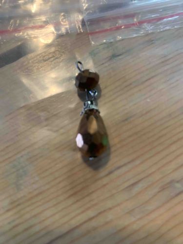 This item is a decorative pendant featuring two faceted glass beads connected by silver-tone metal components. The primary element is a large, teardrop-shaped glass bead in a smoky amber or topaz color, featuring machine-cut facets designed to enhance light refraction and brilliance. Above the teardrop is a smaller, round faceted bead of the same color, creating a articulated drop effect. The beads are assembled using a silver-colored metal eye pin, which terminates in a simple wire loop at the top for suspension. A small, decorative metal spacer or bead cap is positioned between the two glass elements, featuring a textured or floral-inspired design that adds a vintage-style flair. In terms of condition, the item appears to be in fair to good state, though the metal components show slight signs of oxidation and the wire loop is slightly misshapen, suggesting it has been used or handled. There are no visible maker's marks or stamps, which is common for costume jewelry or craft components. The style is contemporary with vintage-inspired elements, likely used as an earring component or a small necklace charm. The craftsmanship is functional but indicative of mass-produced fashion jewelry rather than high-end artisan work, as evidenced by the simple wire-wrapping technique.