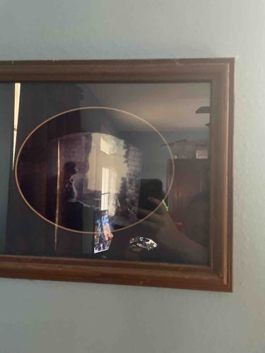 This item is a wall-mounted piece of art featuring a rectangular wooden frame with a medium-brown wood grain finish. Inside the frame is a dark-colored mat with a distinctive oval cutout through which a photograph or printed image is displayed. The central image appears to depict the historic ruins of Fort Pike, showing masonry structures and arched architectural elements typical of 19th-century coastal fortifications. The framing consists of standard mitered corners and a traditional profile. The glass surface exhibits significant reflection, capturing the surrounding room environment and the photographer, which obscures some fine details of the internal print. The matting appears to be a black or dark charcoal color with a thin gold or light-colored bevel around the oval opening, suggesting a decorative 20th-century assembly. Based on the visual evidence, the frame shows some minor surface wear and dust along the upper edge, but the internal artwork appears to be well-preserved within its housing. The overall composition suggests a commemorative or souvenir piece related to Louisiana historical sites, likely originating from the mid-to-late 20th century.