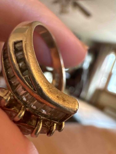 This is a yellow gold fashion ring featuring a tiered multi-stone design. The primary decoration consists of two parallel curved vertical channels, each precisely set with a row of rectangular baguette-cut clear stones. These baguettes appear to be step-cut, providing a geometric brilliance typical of mid-to-late 20th-century jewelry styles. Adjacent to these channel-set rows is a cluster of round-cut stones secured by traditional prongs. The ring is constructed from a yellow-toned metal, likely 10k or 14k gold, though no hallmarks are visible in this specific orientation. The shank is thick and tapers slightly toward the base. Regarding condition, the metal surfaces show significant signs of wear, including numerous fine surface scratches, abrasions, and a dulling of the original high-polish finish. There is also evident accumulated debris and oxidation between the prongs and around the stone settings, which suggests frequent wear. The stones themselves appear intact but would benefit from professional cleaning to restore their refractive quality. The style is reminiscent of a 'cocktail' or anniversary band from the 1980s or 1990s, characterized by the use of channel-set baguettes to create a sense of movement and architectural flow.
