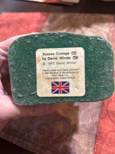 This item is an authentic 'Sussex Cottage' architectural miniature, sculpted by the renowned artist David Winter. Produced in 1982, this piece is part of the early collection of hand-painted, refined gypsum plaster miniatures known for their intricate detail. The base is covered in a characteristic green felt to protect display surfaces and features the original manufacturer's white rectangular label. This label confirms it was 'Hand made and hand painted in the Studios & Workshops of John Hine Ltd.' in Hampshire, Great Britain. The label also displays the British Union Jack flag and the trademark symbols for both the sculptor and the item series. In terms of construction, the piece showcases the high-quality craftsmanship of the John Hine studio, utilizing refined gypsum plaster (crystacal) which allows for deep architectural relief and realistic textures. The condition of the label shows moderate foxing and yellowing consistent with a piece over 40 years old, while the green felt shows some minor accumulation of dust and fibers. There are no visible chips or structural damage to the base perimeter shown in the photograph, though the overall patina reflects its vintage status from the early 1980s British collectible era.