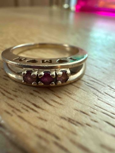 This is a contemporary styled mother's ring, characterized by a unique two-piece mechanical construction. The piece features a fixed inner band and an outer rotating band, creating a 'spinner style' effect. The metal appears to be a combination of yellow gold (or gold-plated) and white metal, possibly white gold or silver. The upper flat surface of the band is laser-cut or stamped with the sentiment 'I <3 MOM' in a clean font. Positioned centrally below this inscription on the lower rail of the band is a cluster of three small, round-cut gemstones. These stones exhibit a deep reddish-pink hue, characteristic of rubies or rhodolite garnets. The stones are held in a shared-prong setting that is integrated into the band's structure. The finish shows signs of moderate wear, including fine surface scratches consistent with regular use, and a slight oxidation or dullness on the white metal portions. This style of personalized jewelry gained significant popularity in the late 20th to early 21st century. The craftsmanship is commercial grade, suggesting a retail or mass-produced origin rather than a bespoke artisan piece. No visible hallmarks are shown, though they would typically be found on the interior shank surface.