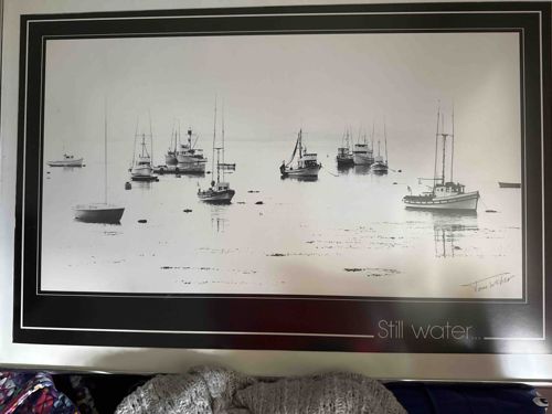 This item is a large-format landscape oriented art print titled "Still water..." by the artist Toni Weber. The piece is a black and white photograph or photorealistic graphic depicting a serene coastal scene with several fishing boats and sailboats anchored in calm, reflective water. The composition utilizes a high key lighting effect where the background atmosphere blends into a white void, emphasizing the silhouettes and fine details of the boat riggings. A notable feature is the printed signature of the artist, 'Toni Weber', in the lower right-hand corner, along with the title 'Still water...' printed in a modern sans-serif typeface on the lower right border. The print is housed in a contemporary black frame with a prominent white pinstripe double-border design that gives the appearance of integrated matting. Materially, the piece appears to be a lithographic or inkjet print on paper, protected by glass or acrylic. The condition appears fair to good; however, there is significant light glare visible in the center and bottom-right quadrant of the image which may indicate a glossy finish or reflections on the protective glazing. The craftsmanship is professional, indicative of mass-market decor from the late 20th century, likely the 1980s or 1990s based on the typography and framing style. No significant physical damage is immediately apparent from the photograph, but slight rippling or age-related toning of the paper may be present under the glass.
