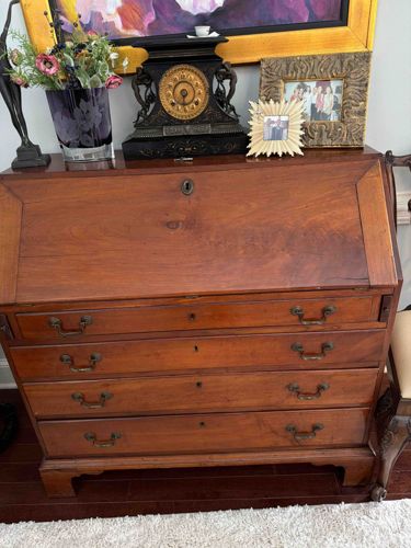 This is a fine antique slant-front desk, likely dating from the late 18th to the mid-19th century, crafted from a rich, warm-toned wood such as cherry or mahogany. The piece features a traditional fall-front lid that opens to reveal an interior writing surface and likely a series of pigeonholes and small drawers. Below the desk portion are four graduated full-width drawers, providing ample storage. The construction demonstrates high-quality craftsmanship characteristic of the Federal or Hepplewhite periods, featuring original-style brass 'batwing' or bail-and-rosette hardware and an escutcheon on the fall-front. The desk sits on a molded base terminating in bracket feet. Visually, the piece exhibits a beautiful aged patina with a deep luster. There is a visible horizontal crack or seam on the fall-front lid, which is common in solid wood pieces of this age due to seasonal expansion and contraction. Minor surface scratches and professional wear near the base are evident, consistent with its hundred-plus-year history. The joinery appears tight, suggesting it has been well-maintained. While no specific maker's mark is visible in this view, the balanced proportions and refined moldings indicate it was produced by a skilled cabinetmaker of the era.