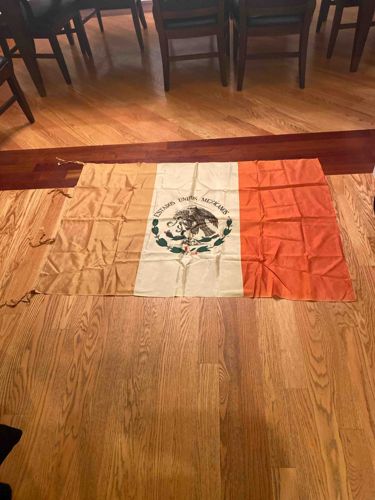 This is a medium-sized horizontal tricolor flag of Mexico, featuring the traditional vertical stripes of green, white, and red. The central white stripe displays the National Coat of Arms (Escudo Nacional), which depicts a Mexican golden eagle perched on a prickly pear cactus devouring a rattlesnake, framed by an oak and laurel wreath. Above the eagle, the text 'ESTADOS UNIDOS MEXICANOS' is inscribed in a semi-circular fashion. The material appears to be a lightweight synthetic fabric, likely polyester or a nylon blend, given its sheen and the sharp creasing visible from being folded. The construction includes a reinforced hoist side on the left, which features multiple braided rope ties or cords for securing the flag to a pole or line. The colors appear slightly muted or altered by indoor lighting; the green section on the left looks olive or gold-toned, though this is likely a photographic artifact. Regarding condition, the flag displays prominent fold lines and numerous wrinkles across the entire surface, suggesting long-term storage in a folded state. There are no immediate signs of fraying at the edges or sun-fading, indicating it may have been used primarily indoors or stored away. It represents a standard modern design (post-1968) typically used for official decorative or ceremonial purposes.